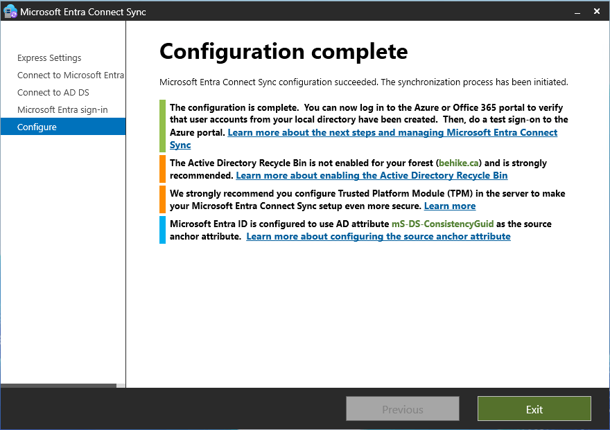 In this article we installed the Entra Connect tool, and configured it for a simple sync that connects our local AD DS domain to our cloud Entra tenant.